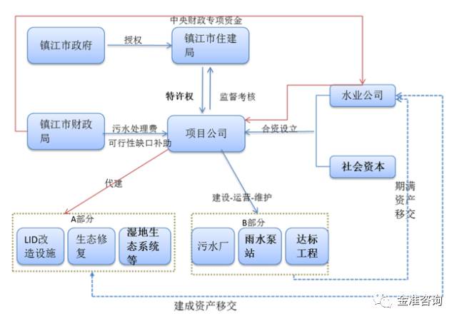 A部分项目业主为镇江水业总公司,采用中央补贴海绵城市投资的专项资金12亿元建设,建设内容包括道路及小区LID改造、生态修复和引水活水工程、湿地生态系统等项目。为便于统一协调项目建设管理工作,部分采用代建模式,由委托PPP项目公司代建,项目建成后资移交至镇江市水业总公司。