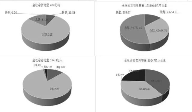 运输量位居世界前位。2015年,全社会完成客运量194.3亿人、旅客周转量30047亿人公里;完成货运量410亿吨、货物周转量173690.6亿吨公里。铁路旅客周转量、货运量居世界第一,货运周转量居世界第二,公路客货运输量及周转量、水路货运量及周转量均居世界第一,民航运输总周转量、旅客周转量、货邮周转量均居世界第二。全国港口完成货物吞吐量和集装箱吞吐量均居世界第一。邮政业年服务用户超过700亿人次,快递年业务量居世界第一,大型网络购物促销“双11”活动单日处理峰值超过1.6亿件。管道货运量达7.1亿吨,周转量达4138.8亿吨公里。