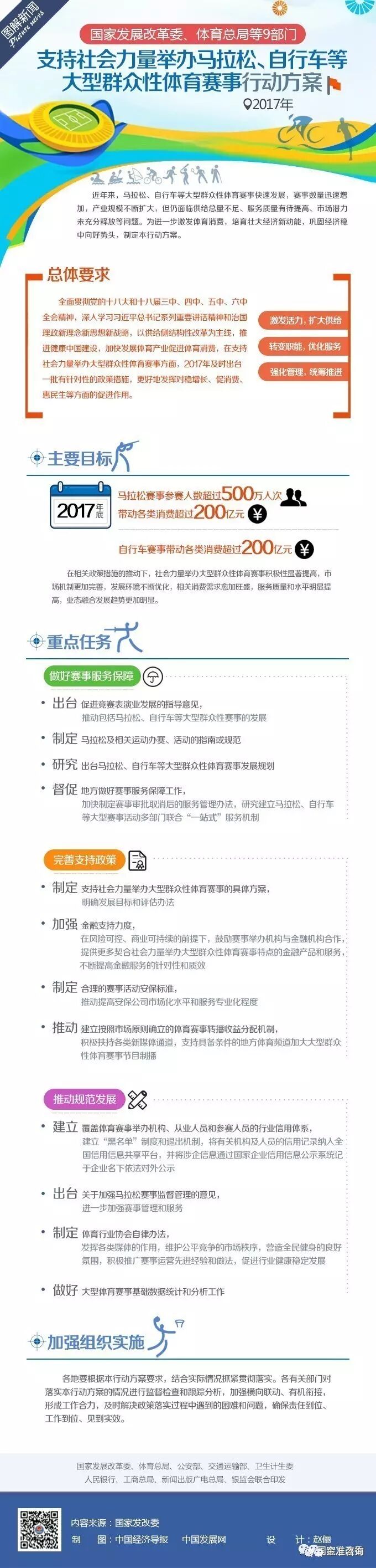 公司新闻 行业资讯 项目动态 政策法规 公司新闻 行业资讯 项目动态 政策法规 当前位置: 首页» 资讯中心» 行业资讯 行业资讯 一图读懂:《关于支持社会力量举办马拉松、自行车等大型群众性体育赛事行动方案(2017年)》 发布日期:2017-07-13 作者: 来源:国家发改委网站