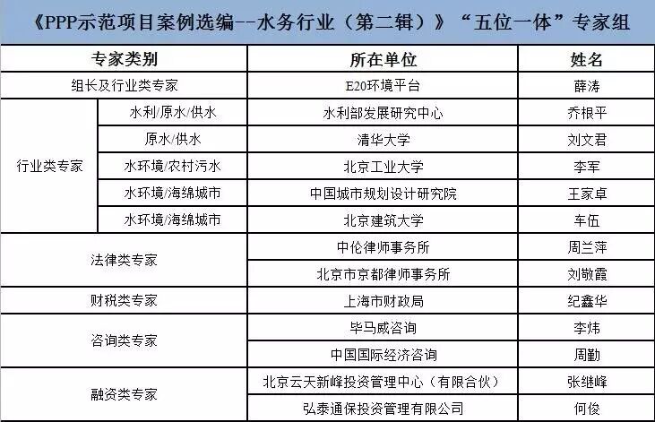 在最初的启动会上,E20环境研究院牵头协调组织成立了包含上述五类专家的专家组,如下表所示,专家类别有效覆盖水务PPP案例设计的细分行业领域。