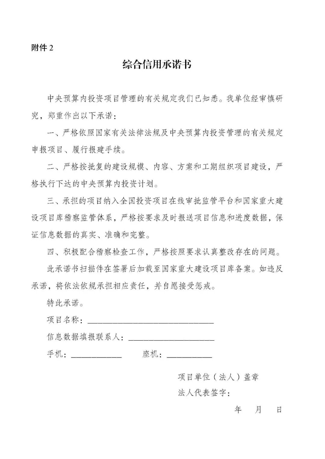 ( 二) 收到投资计划文件两个工作日内, 应当按要求签署综合信用承诺书( 格式见附件2);